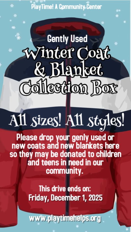 To collect donations at your organization, please take a large empty box and place this printed flyer on the side. To receive information about the drop-off dates and times, please contact us at give@playtimehelps.org. Please refer to our "Donation Guidelines" for tips.